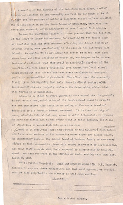 EWP 2-5-B Yr 1930 Waterford Protest that Waterford will not be an accredited High school At a meeting of the citizens of Waterford, Va. and community, on March 13, 1930 called for the purpose of discussing the proposed changes contemplated being made in our schools of Loudoun County, after receiving a copy of the recommendations from the County Survey Committee, the following Committee was appointed to act in behalf of the Waterford High School as they may deem fit. Rev. John A. Bowman, Talbot E. Pierce, William S. Smoot, Douglas N. Myers, W.I. Mann, James Carr. C.N. Mason, R.E. McCarty, Frederick Stabler, immediately after the adjournment of this meeting the above named Committee met and formulated the following appeal to the School Board of Loudoun County, at its meeting to be held on March 18, 1930 in the School Auditorium at Leesburg, Va. (1) We respectfully appeal to you to keep the Waterford High School on the accredited list of high schools. Here is a good school, fully equipped and serving well a rural community, which enjoys none too many advantages. It would be a step backward in education to take away a high school that has been established over twenty years and deprive the pupils of the advantages they are entitled to have, and for which we pay taxes. Gov. Pollard recently said "Education is the foundation of the whole state, to be exercised for the benefit of all children within its borders. The Waterford High School is not to blame for having under thirty-five pupils this year. We now have an excellent Principal and good teachers. We have reasons to know that if allowed to continue as at present, we will have the allotted number of pupils for the school term 1930-31, (2) We suggest a zone system and recommend that children in these zones attend their respective schools. (3) We are opposed to the consolidation of schools, and bus transportation as morally detrimental to the children of any community But in event consolidation of smaller schools is more fully carried out. we urge that the schools at Wheatland, Paeonian Springs and Clarks Gap, be consolidated with the Waterford school. (8) For the educational benefits of Loudoun and its present and future welfare we are unanimously opposed to the practice of employing an itinerant teacher. Respectfully submitted. Rev. John A. Bowman, W.S. Smoot, ( (Committee) W.I. Mann, C.N. Mason, R.E McCarty, Fredk. Stabler, Talbot E. Pierce, Douglas N. Myers, James Carr. -