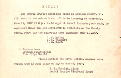 EWP2-3Yr1947MayNoticeofJuneElectoralBrdMeetingonBroadRunandLovettsvilleDistricts In June 1947, the School Trustee Electoral Board of Loudoun County, Virginia published a notice in local newspapers requesting the appointment of school trustees for the Broad Run and Lovettsville districts on the County School Board. The meeting was scheduled for June 11, 1947 at 2 pm in Leesburg, with the term beginning on July 1 of the same year. The names of potential appointees, R. J. McCray, J. S. Whitmore, and W. H. Grubb, were included in the notice. The Clerk of the School Trustee Electoral Board, O. L. Emerick, requested the publication of the notice in newspapers such as the Loudoun News, Loudoun Times-Mirror, and Blue Ridge Herald on May 22 and 29, 1947.
