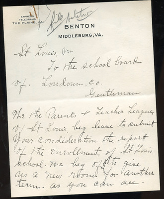 Estimated date = 1930s. The petition requests school bus transportation for colored students to the 'Loudoun County Training Center' it's assumed to be Pre-Douglass High School (1941). Students are from Willisville, St Louis, Middleburg Colored, Bull Run (Aldie) and Gleedsville (Mountain Gap Colored). Additional petition signees to those in 'EWP 02-5 A Yr Unknown Petition for school bus transportation for colored students to the Loudoun County Training Center', otherwise it appears to be the same petition.