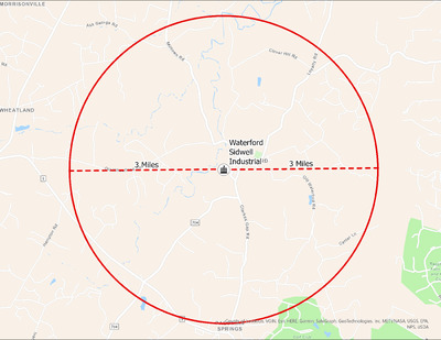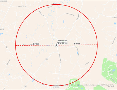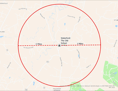 EWP 09 Waterford 2nd St with 3 mile It's estimated that the maximum distance students would have walked to this school is 3 miles one way. The graphic shows the area from which students may have walked to this school. - EWP 9-2-3Yr1947WhiteWaterfordAddition