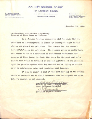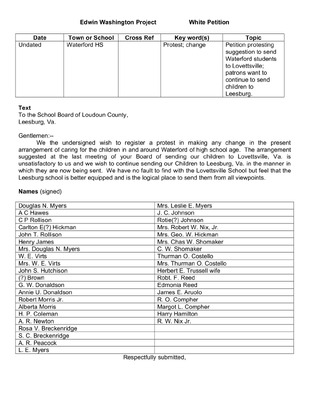 EWP 2-5-B Yr Unk Waterford Protest Sending kids to Lovettsville This letter, addressed to the School Board of Loudoun County in Leesburg, Virginia, reveals the sentiments of a group of white parents regarding the education of their high school-aged children in the early 20th century. The signatories express their strong objection to a proposed change that would see their children sent to Lovettsville instead of Leesburg for schooling. They make it clear that they believe Leesburg is better equipped and more suitable for their children from all perspectives.