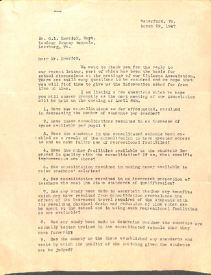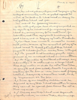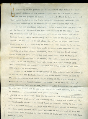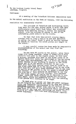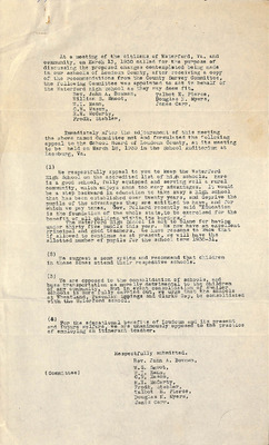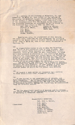 EWP 2-5-B Yr 1930 Waterford Protest that Waterford will not be an accredited High school At a meeting of the citizens of Waterford, Va. and community, on March 13, 1930 called for the purpose of discussing the proposed changes contemplated being made in our schools of Loudoun County, after receiving a copy of the recommendations from the County Survey Committee, the following Committee was appointed to act in behalf of the Waterford High School as they may deem fit. Rev. John A. Bowman, Talbot E. Pierce, William S. Smoot, Douglas N. Myers, W.I. Mann, James Carr. C.N. Mason, R.E. McCarty, Frederick Stabler, immediately after the adjournment of this meeting the above named Committee met and formulated the following appeal to the School Board of Loudoun County, at its meeting to be held on March 18, 1930 in the School Auditorium at Leesburg, Va. (1) We respectfully appeal to you to keep the Waterford High School on the accredited list of high schools. Here is a good school, fully equipped and serving well a rural community, which enjoys none too many advantages. It would be a step backward in education to take away a high school that has been established over twenty years and deprive the pupils of the advantages they are entitled to have, and for which we pay taxes. Gov. Pollard recently said "Education is the foundation of the whole state, to be exercised for the benefit of all children within its borders. The Waterford High School is not to blame for having under thirty-five pupils this year. We now have an excellent Principal and good teachers. We have reasons to know that if allowed to continue as at present, we will have the allotted number of pupils for the school term 1930-31, (2) We suggest a zone system and recommend that children in these zones attend their respective schools. (3) We are opposed to the consolidation of schools, and bus transportation as morally detrimental to the children of any community But in event consolidation of smaller schools is more fully carried out. we urge that the schools at Wheatland, Paeonian Springs and Clarks Gap, be consolidated with the Waterford school. (8) For the educational benefits of Loudoun and its present and future welfare we are unanimously opposed to the practice of employing an itinerant teacher. Respectfully submitted. Rev. John A. Bowman, W.S. Smoot, ( (Committee) W.I. Mann, C.N. Mason, R.E McCarty, Fredk. Stabler, Talbot E. Pierce, Douglas N. Myers, James Carr. -