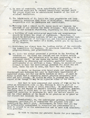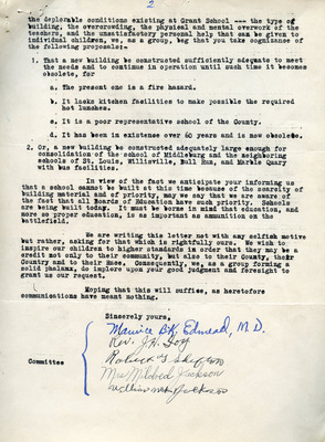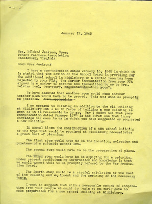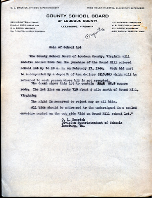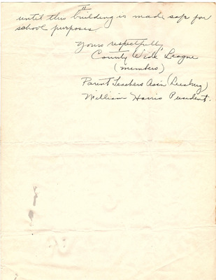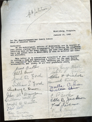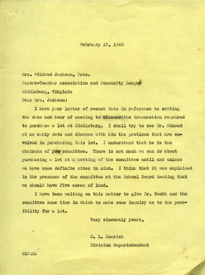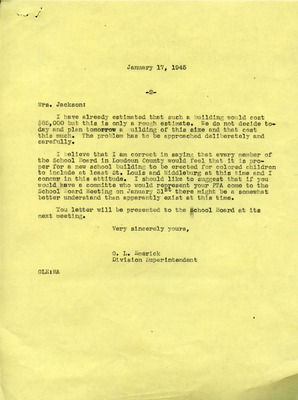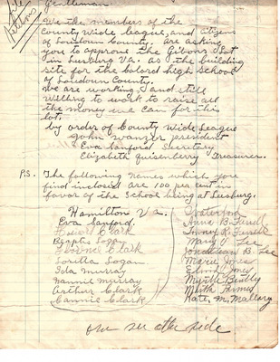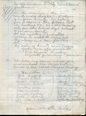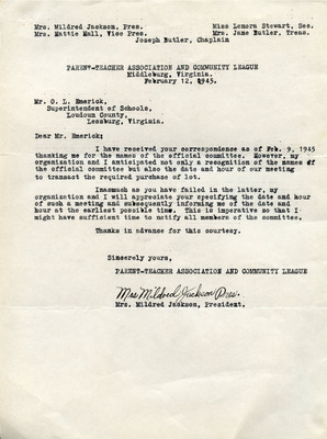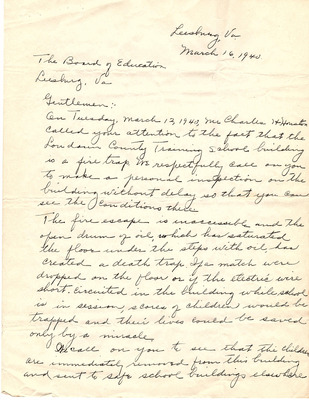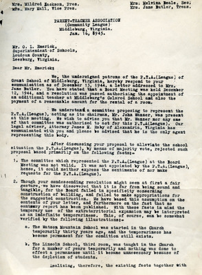 March 20, 1945 County-Wide League of Loudoun letter to Superintendent Emerick and School Board endorses Janie Redmond recommendations made on March 6, 1945. These included Teacher Grade load decrease through school consolidation, providing necessary transportation, building repairs, school supply requests, infrastructure upgrades, additional teachers and maintenance custodians