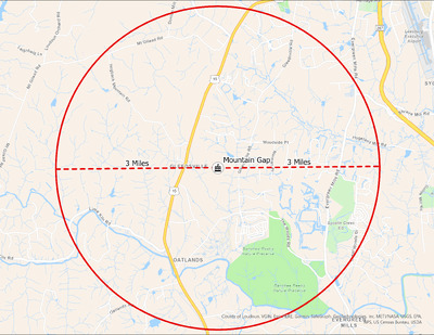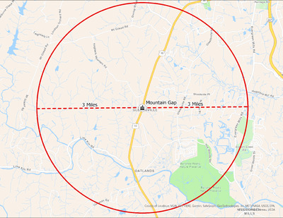 EWP 09 Mountain Gap White with 3 mile It's estimated that the maximum distance students would have walked to this school is 3 miles one way. The graphic shows the area from which students may have walked to this school. -