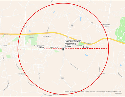 EWP 09 Harmony Church Freedmans School with 3 mile It's estimated that the maximum distance students would have walked to this school is 3 miles one way. The graphic shows the area from which students may have walked to this school.
