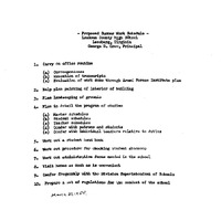 summer work schedule, Loudoun County High School, Leesburg, Virginia, Principal George D. Grov, office routines, correspondence, transcript execution, evaluation of work, Armed Forces Institute, painting, landscaping, program of studies, schedules, student handbook, absences, administrative forms, school conduct, Division Superintendent of Schools, regulations