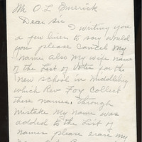 letter, January, Middlibery, Mr O.L. Emerick, voter list, Middlehing, Rev. Roy, new school, support, project, individual choice, agency, political matters, discrepancies, errors, registration process, accuracy, transparency, electoral procedures