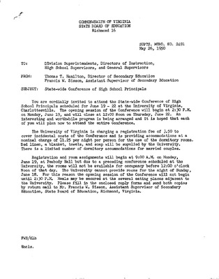 The text provides a glimpse into the education system and administrative practices of Virginia in the early 1950s. It highlights the efforts to improve the professional development of principals, with discussions centered around the importance of attending national conferences. The motion passed at the Secondary School Principals Association meeting emphasizes the role of School Boards in supporting principals in attending such events. State-wide conferences for high school principals are being planned to focus on enhancing educational programs for students. Additionally, the Principals' Conference conducted at the Annual School Board Office covers various topics including student activities, grading systems, exam schedules, and administrative responsibilities. This historical document sheds light on the collaborative efforts and ongoing initiatives within the education sector during that era, aiming to uplift the quality of education and professional growth of school principals.